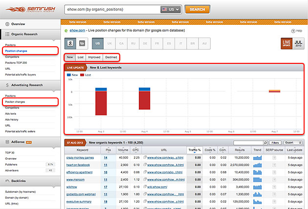 Advertising research on the other hand shows you the results of your competitors’ advertising campaigns: the amount of time their ads have been running, how they promote their services, whether longtail or high-volume keywords fuel their ranking, their keyword CPC estimations and the traffic that they receive – information that you can use to improve your advertising efficiency and decrease your budget while at the same time multiplying your results. The PPC Keyword tool analyzes your PPC campaigns and gives you recommendations for getting better results by showing you duplicate keywords, or keywords which cause your own ads to compete for ranking against eachother, so you can remove and change them.