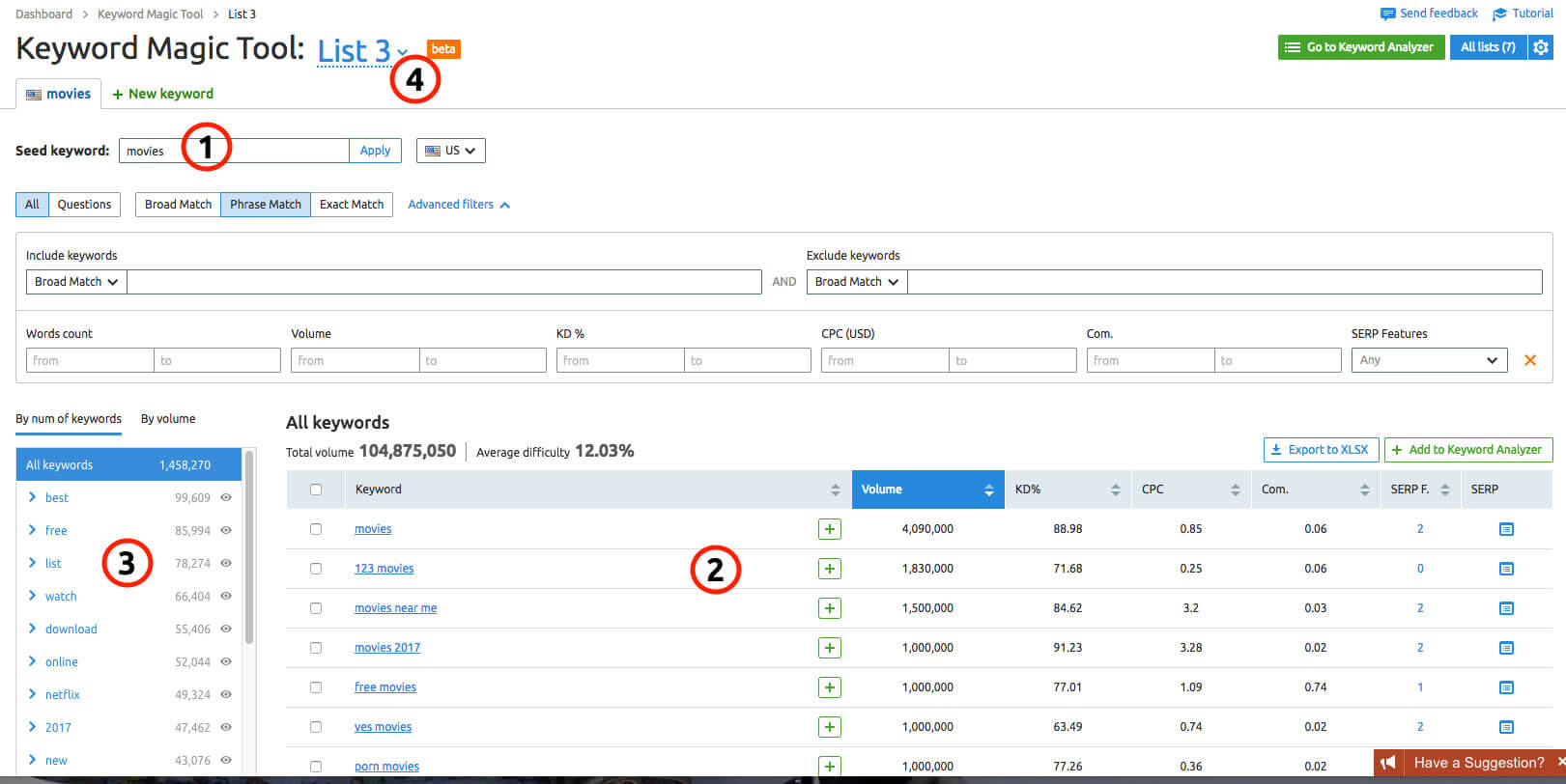Finally, SEMrush’s Keyword Magic Tool can help you find various keywords connected to a “seed” keyword, and thus branch out creating relevant content that appeals to your industry that can consequently help you achieve better results and rankings.