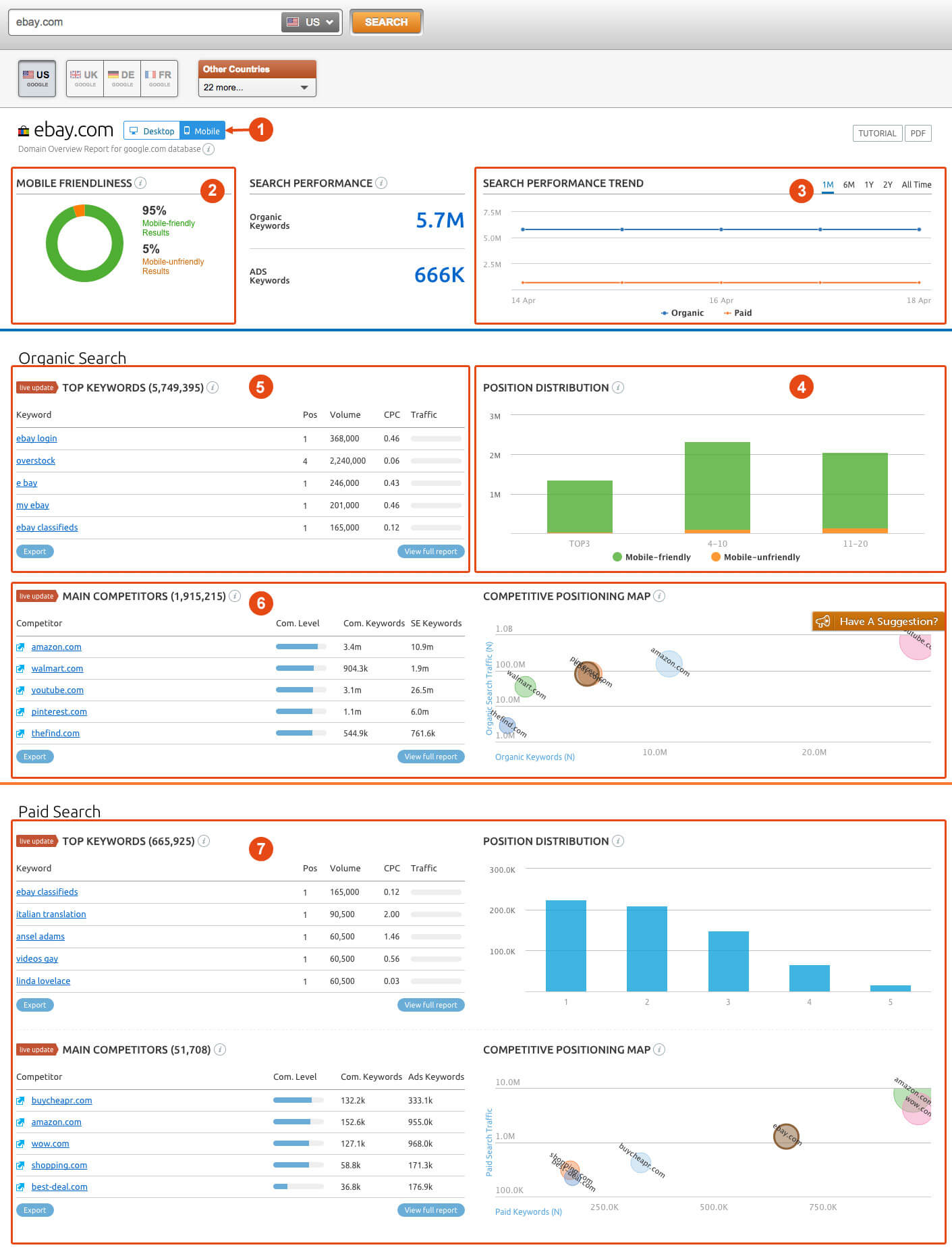 SEMrush’s Analytics Reports show you data on your competitors regarding their organic and paid search, the display advertising, product listing ads and their link building.